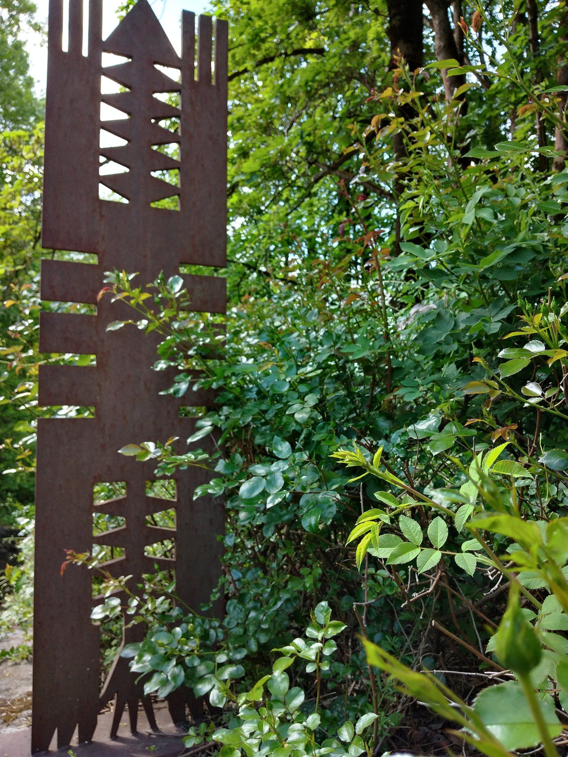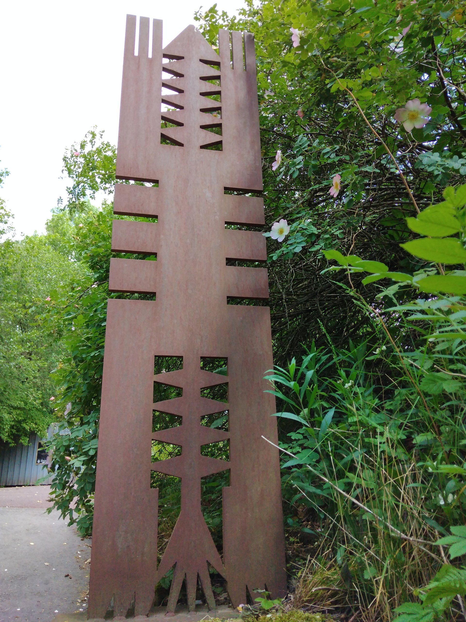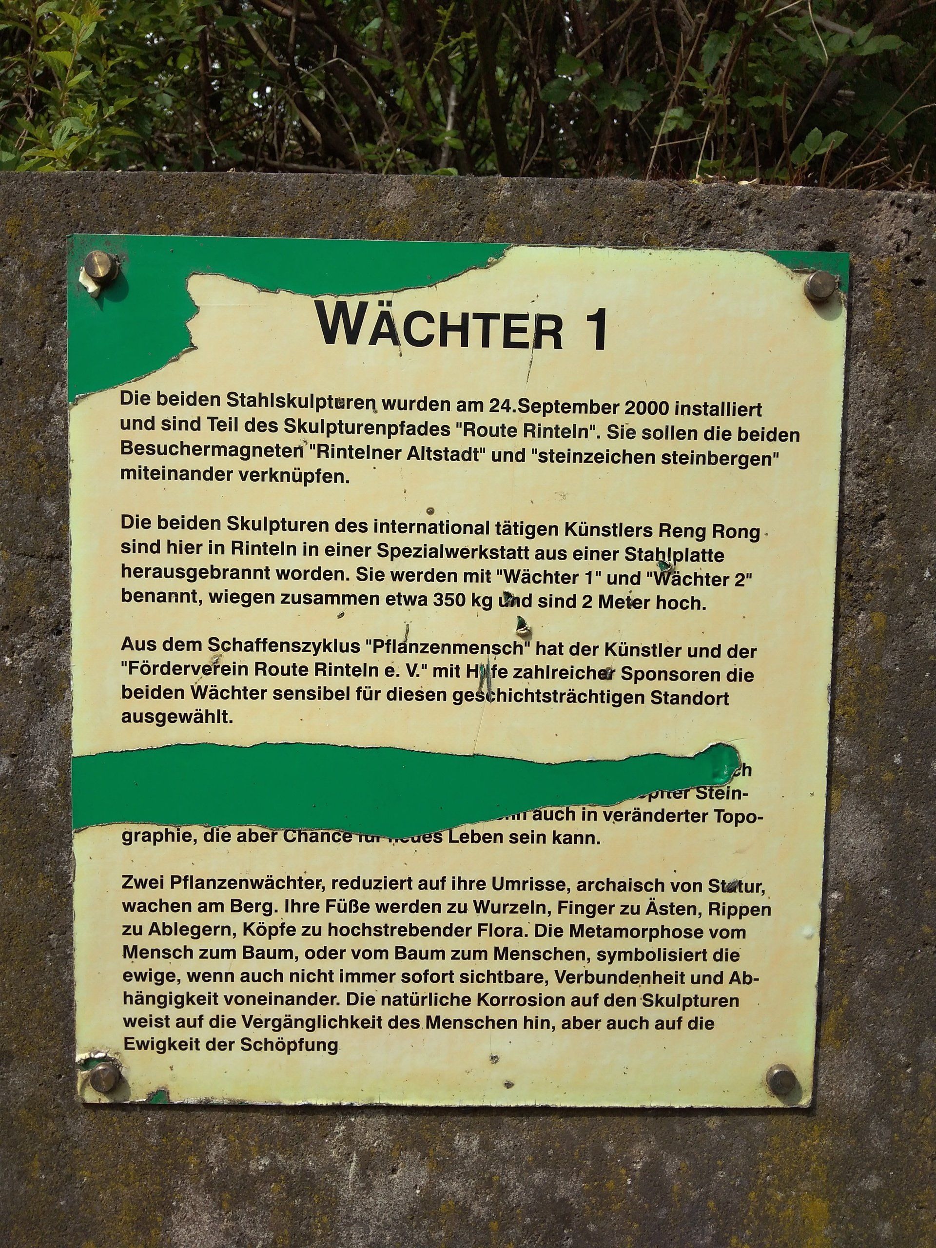 Die beiden Skulpturen des international tätigen Künstlers Ren Rong sind hier in Rinteln in einer Spezialwerkstatt aus einer Stahlplatte herausgebrannt worden. Sie werden mit „Wächter 1" und „Wächter 2" benannt, wiegen zusammen etwa 350 KG und sind 2 Meter hoch.